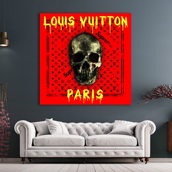The artist of this motif created an unusual motif featuring a gold skull. The logos of the luxury brands Louis Vuitton and Supreme are displayed in black, grunge-style on a red background. It's a perfect fit for your modern living room, bedroom, office, or even hallway.