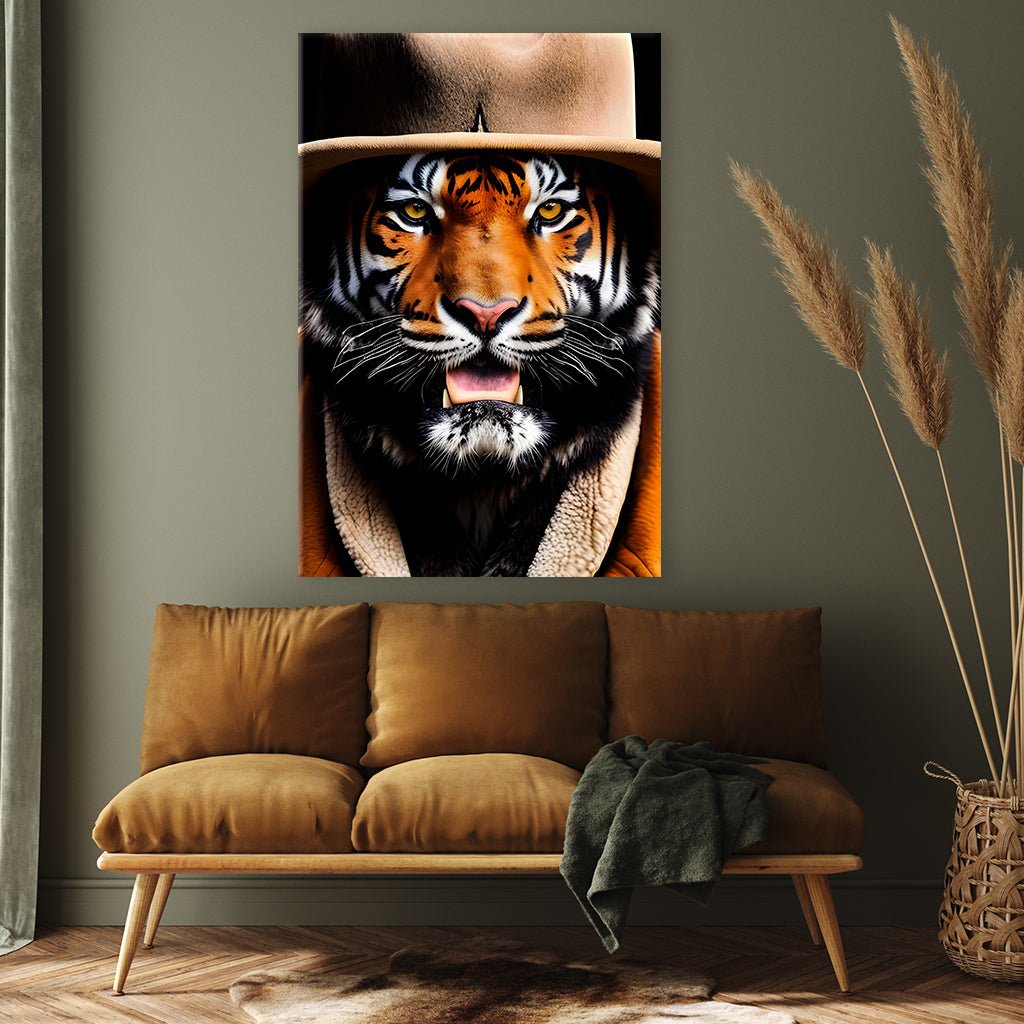 This striking portrait features a majestic tiger wearing a rancher's hat and warm padded jacket. This stunning work of art captures the wild beauty and enigmatic aura of this majestic animal, while conveying a touch of adventure and style.