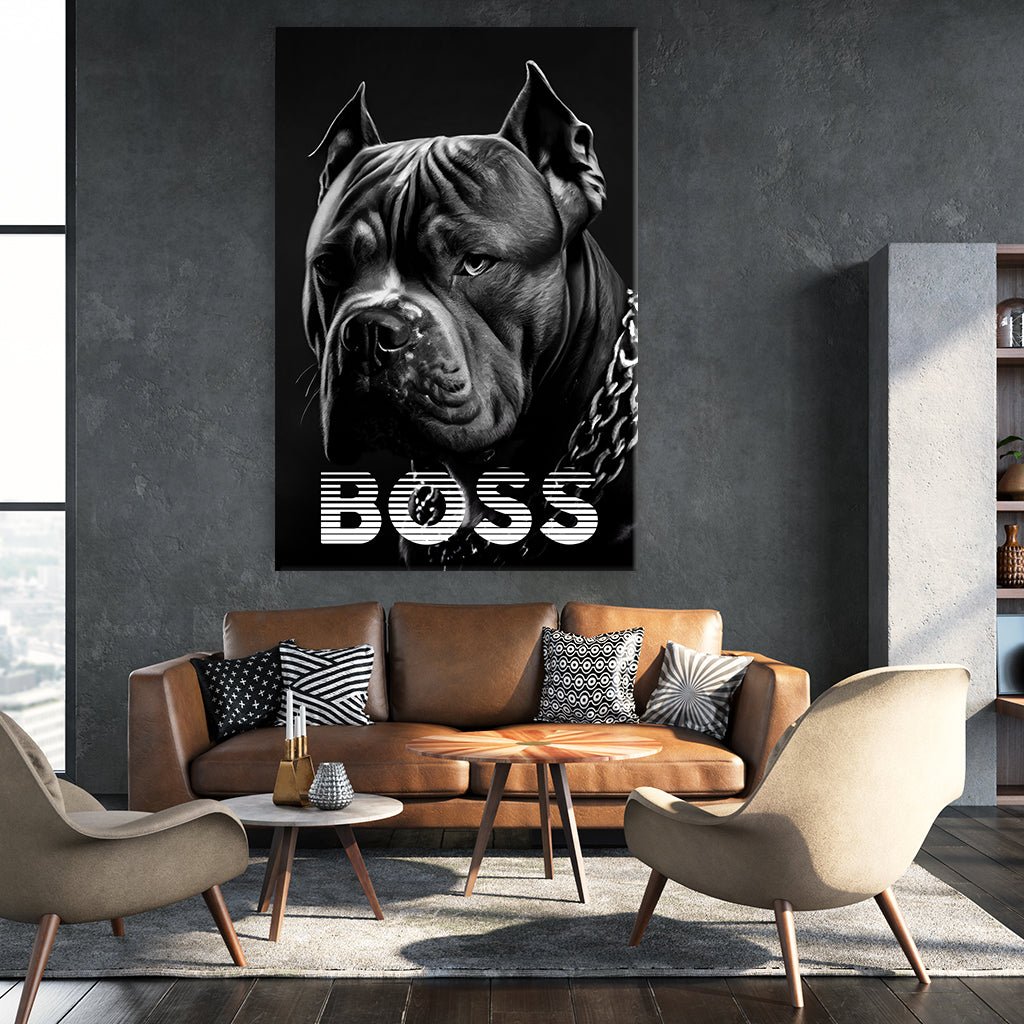 A striking black and white portrait of a fearless powerful pit bull against a dark background. At the bottom of the picture is the lettering "BOSS", which underlines the powerful presence of this fearless dog. An impressive work of art that combines strength and elegance.