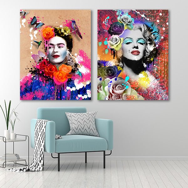 Famous women adorn these two extraordinary motifs. Frida Kahlo and Marilyn Monroe staged in bright colors and a sea of flowers. This modern style is an absolute eye-catcher for any room. Whether in the living room, bedroom or study.