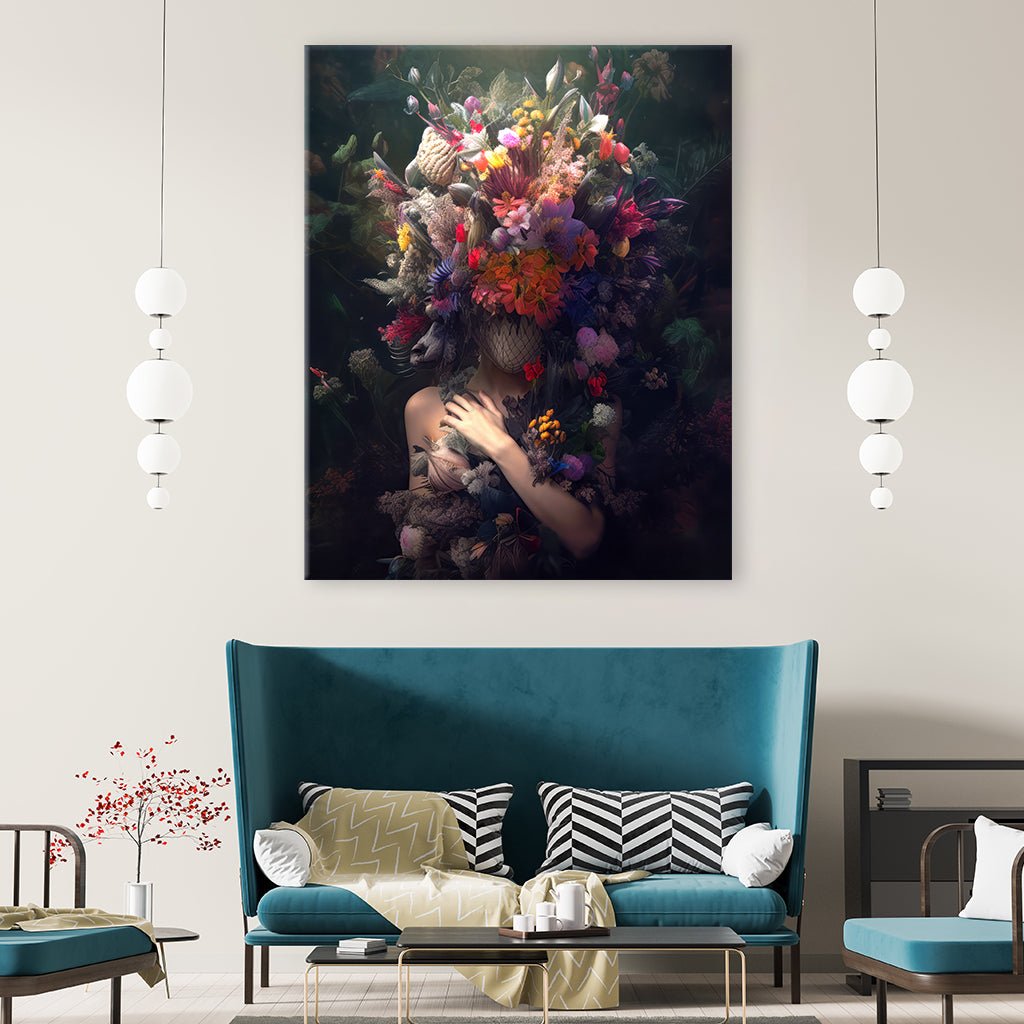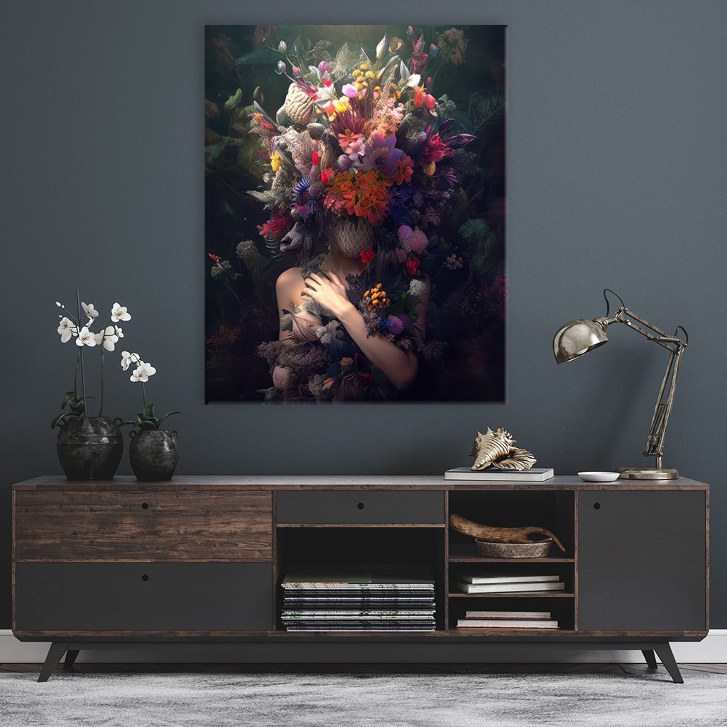 A vibrant sea of flowers, subtly colorful and in an antique style, surrounds a woman at the center of the painting. She is adorned head to toe with flowers, so that only her arm and one shoulder are visible. This work of art depicts the diversity and beauty of nature and exudes a certain elegance.