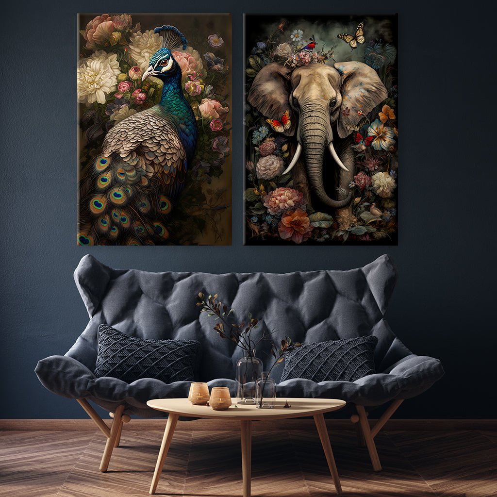 The images show a majestic elephant and a magnificent peacock, both surrounded by a nostalgic color scheme. The majesty of the elephant and the beauty of the peacock shine with a gentle glow of times gone by. Surrounded by flowers, an atmosphere of elegance and natural beauty is created. This enchanting work of art will be an eye-catcher in any room, while the nostalgic color palette brings a touch of romance and nostalgia to your home.