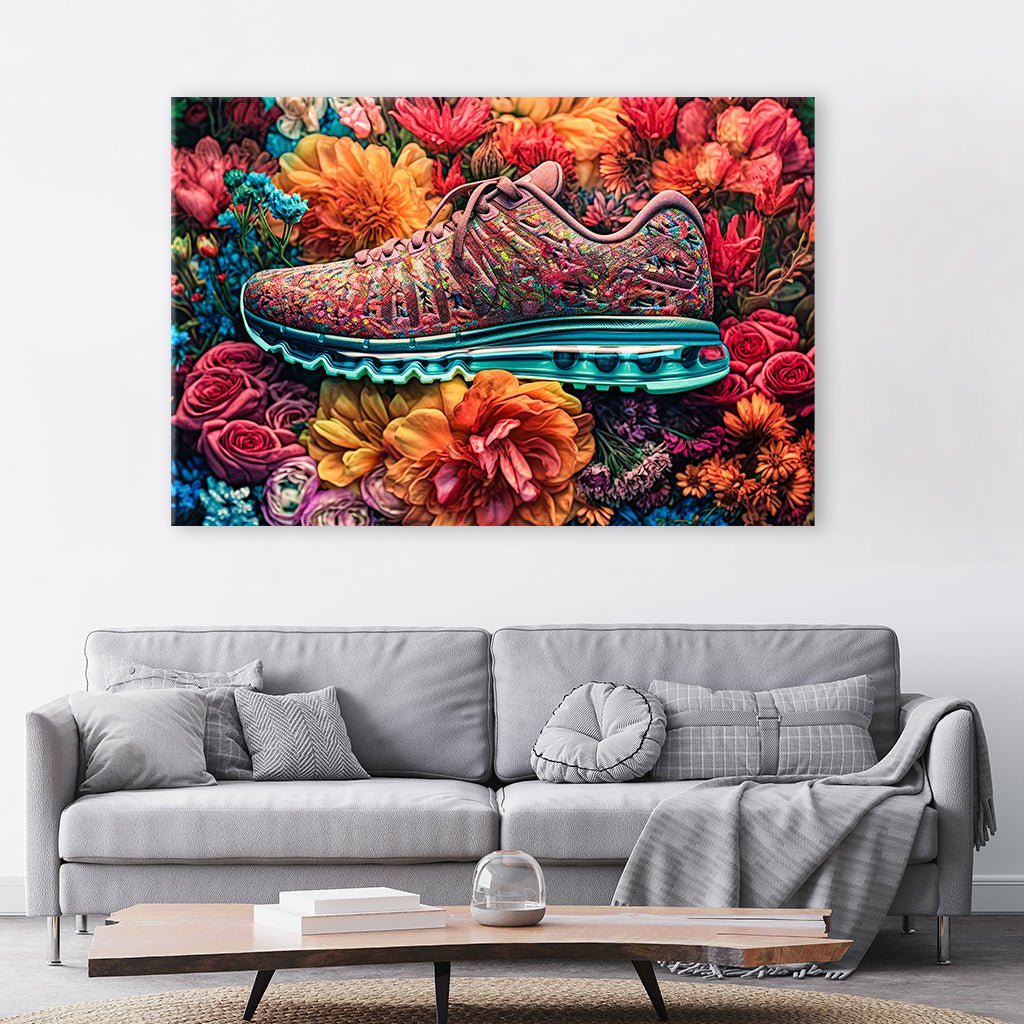 An eye-catching, colorful sneaker is the highlight of this picture. It stands in front of a vibrant sea of flowers in shades of orange and pink, creating a fresh and lively atmosphere. This motif is perfect as an eye-catcher for the living room, hallway or teenager's room and brings an eye-catching touch to the interior.