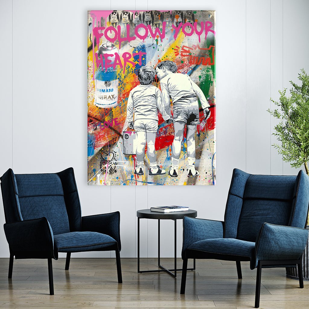 This motif using stencil technique shows two boys holding a paint bucket and a brush in their hands. They have painted “Follow your heart” on the colorful graffiti wall in the background.