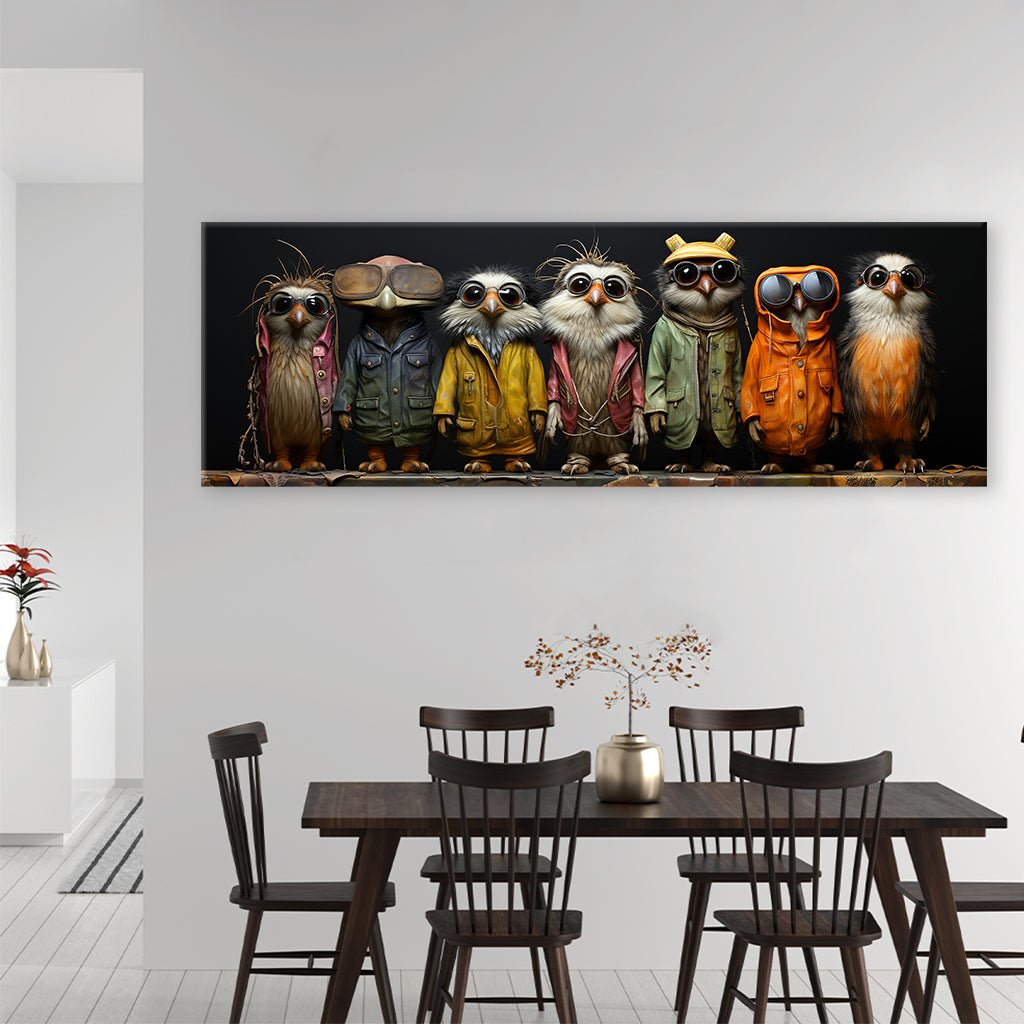 A funny group of seven birds line up in a humorous way. Dressed in tiny coats, chic hats and quirky glasses, they add a playful touch to the scene. A humorous work of art that puts a smile on your face. The perfect eye-catcher for your wall in the living room, bedroom or hallway.