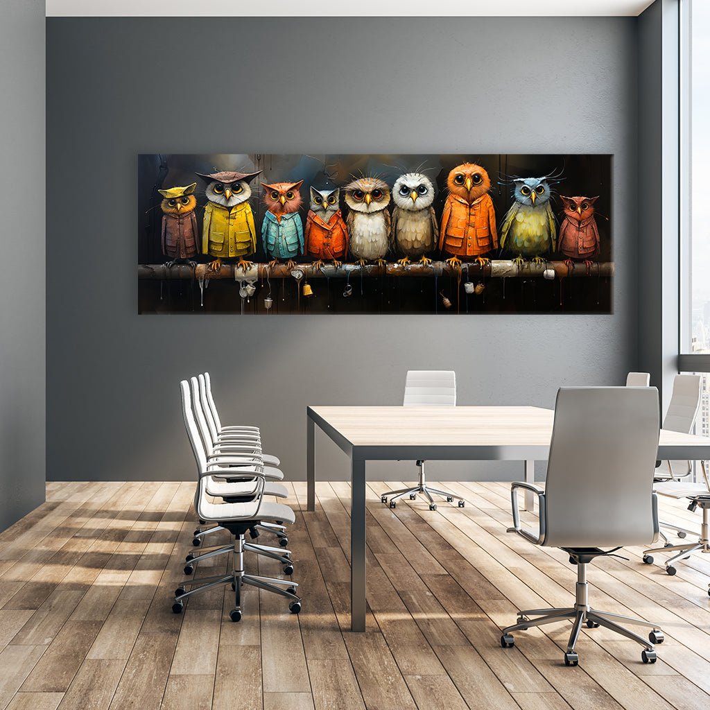 A funny group of nine owls line up in a humorous way. Some of them dressed in tiny coats give the scene a playful touch. A humorous work of art that puts a smile on your lips. The perfect eye-catcher for your wall in the living room, bedroom or hallway.