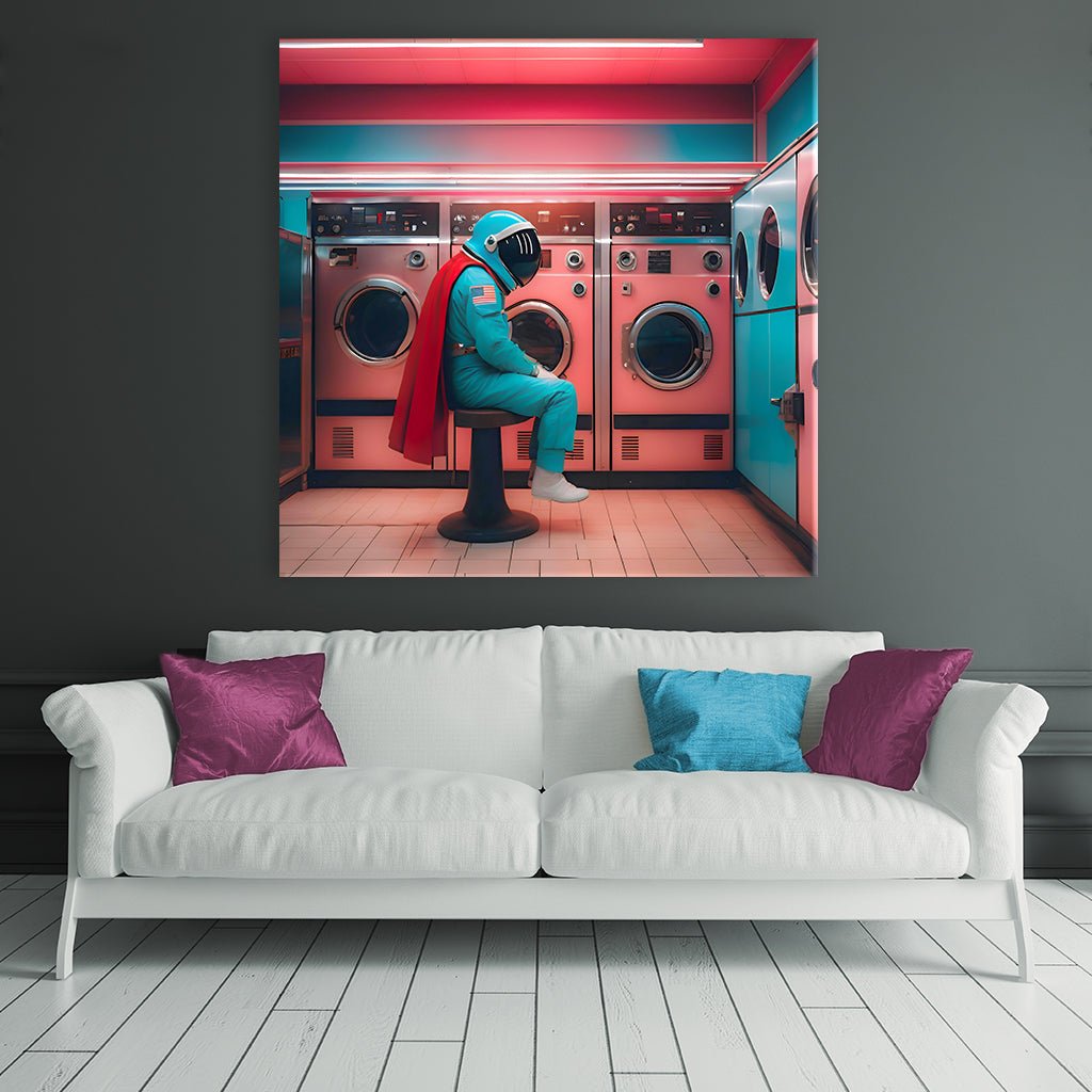 In a surreal scenario, an astronaut in a blue spacesuit with a striking red hero cape sits in a typical American laundry, staring thoughtfully at the row of pink and blue washing machines in front of him. The room is bathed in a soft pink light emanating from a glowing fluorescent tube above him, giving the scene a dreamy, almost melancholic mood.