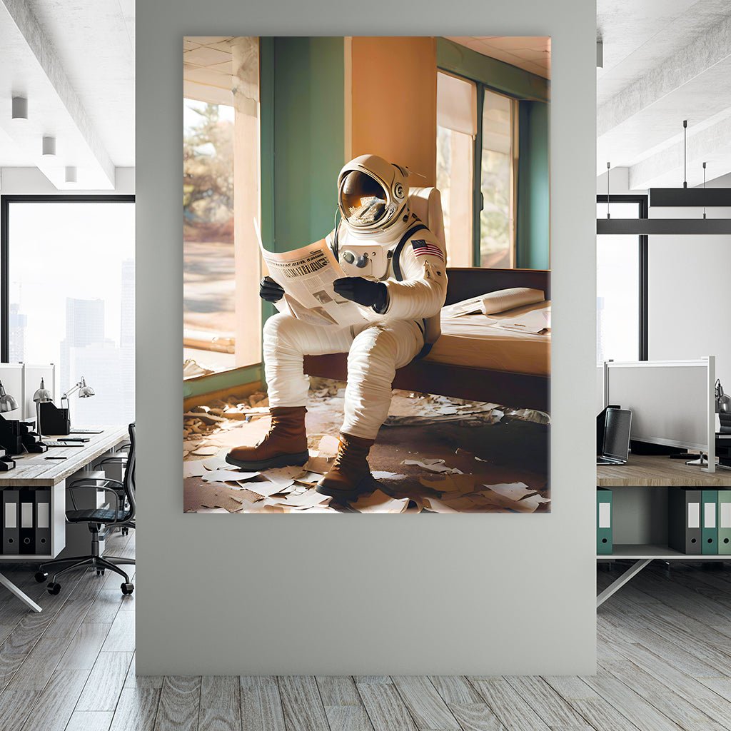 An astronaut sits on the edge of a bed in a seemingly abandoned house, engrossed in a newspaper. Old wall and wallpaper remnants are scattered on the floor. The scenery is in soft green and beige tones, giving the image a calm and melancholic atmosphere. The contrast between the modern astronaut and the dilapidated surroundings creates a fascinating and thoughtful motif.