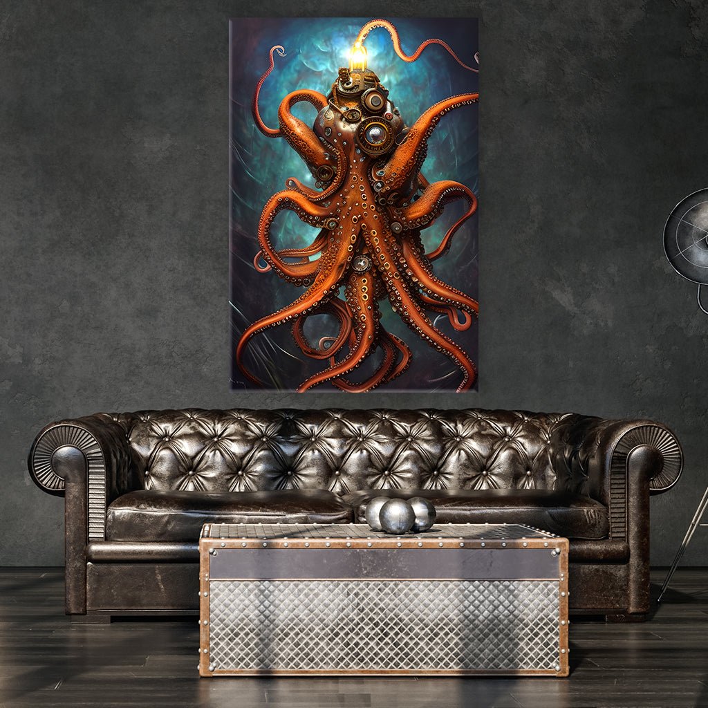 Immerse yourself in a surreal and futuristic world of steampunk with this extraordinary motif. The focus is on an octopus, which is depicted in a unique steampunk style. The extraordinary connection between nature and technology is reinforced by the futuristic aspect of the motif.