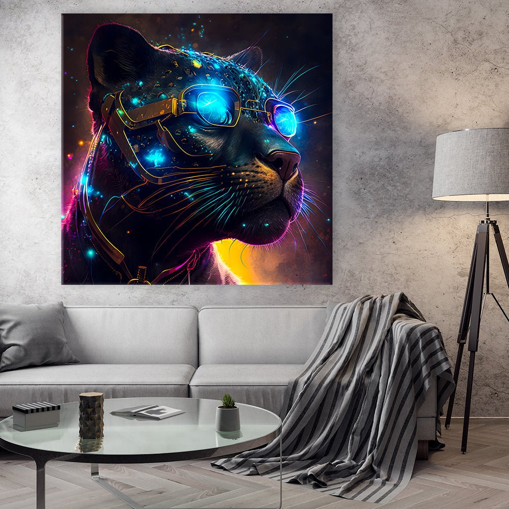 A special black panther with cool sunglasses in which you can see the reflection of the galaxy. The light that surrounds it shines in different colors full of vivid stars that sparkle in shades of blue, purple, and yellow, giving the feeling of vastness and infinity. The Black Panther wears a gold collar that symbolizes his strength and pride. The black panther is a symbol of grace and strength, while the galaxy represents a world of mystery and wonder.