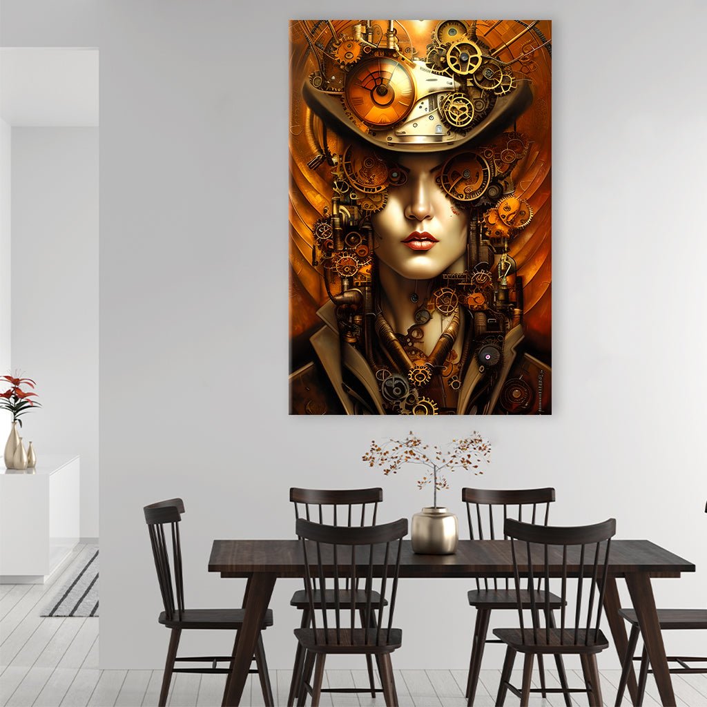 In this fascinating steampunk-inspired scene, the focus is on a man surrounded by a multitude of gears. The gears are in warm brown tones and shimmering bronze tones and form an artistic interplay of mechanics and aesthetics. The man himself embodies the spirit of steampunk madness and is reminiscent of the Mad Hatter from the fantasy world. Immerse yourself in this detailed steampunk world and let yourself be inspired by its creativity and charm.