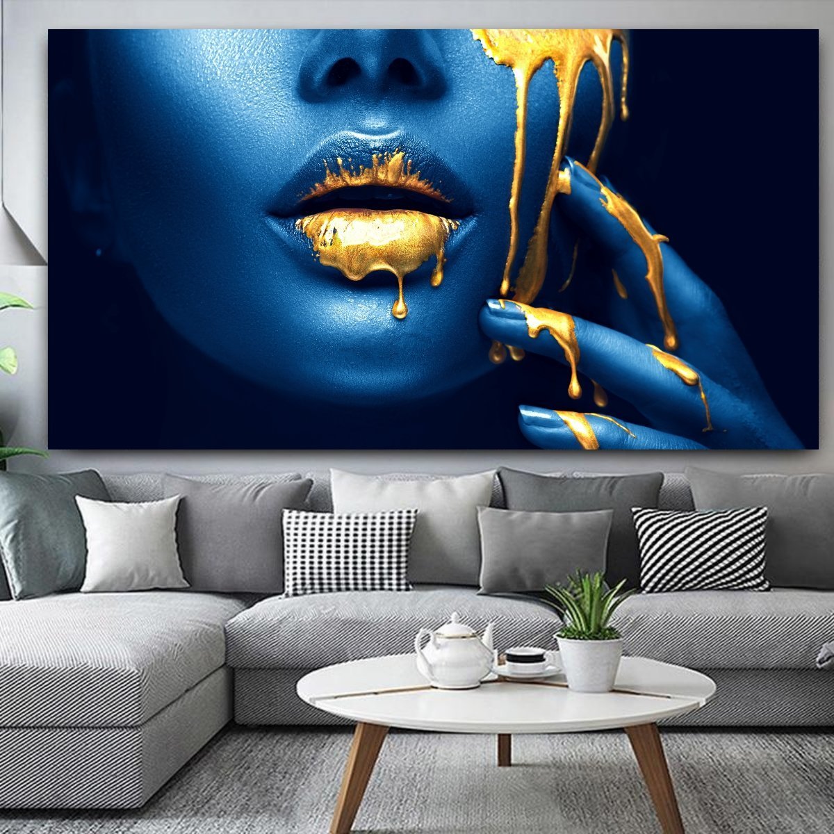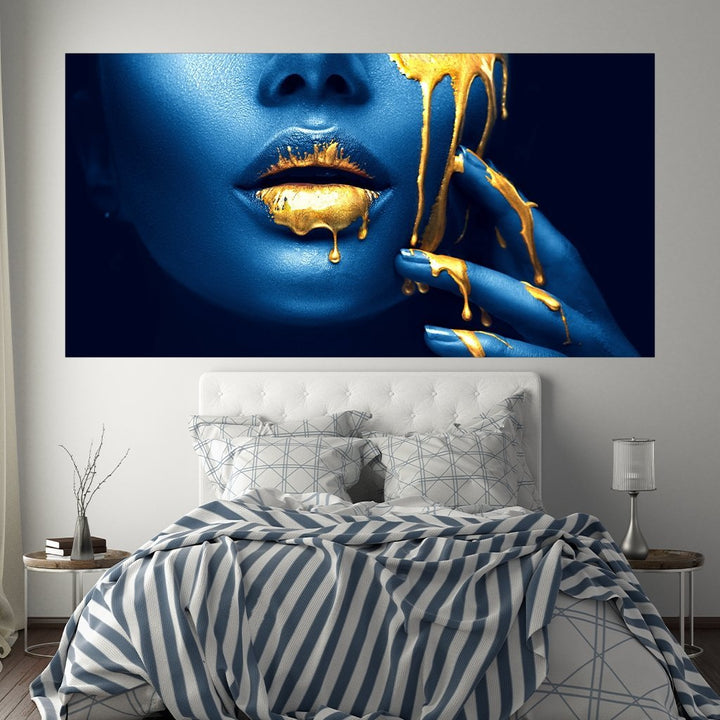 Ambiguous and yet telling. With the golden liquid on her lips and her blue skin, it's the perfect image for your bedroom or modern living room.