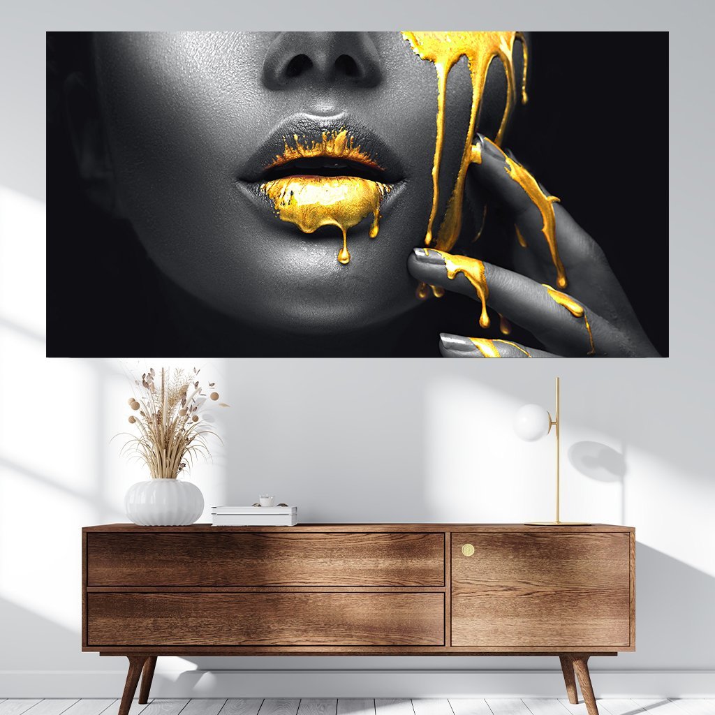Our motif with the golden lips is very stylish and modern. The sensual motif with its golden accents is an eye-catcher in every room.