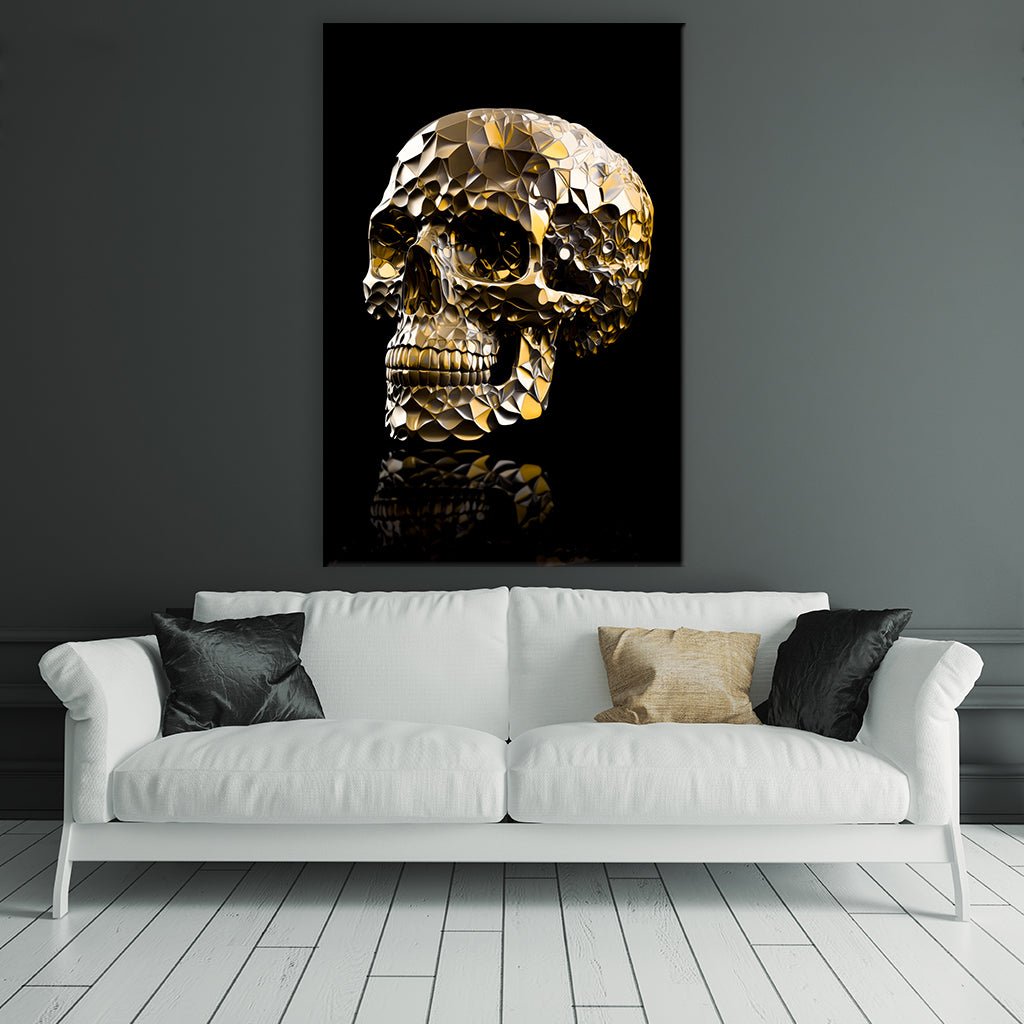 A golden skull with an extraordinary surface shines on a deep black background. This fascinating motif combines elegance and mysticism in one. The skull, made of shiny gold, attracts attention and creates a unique atmosphere. Ideal for spaces that need a touch of luxury and sophistication.