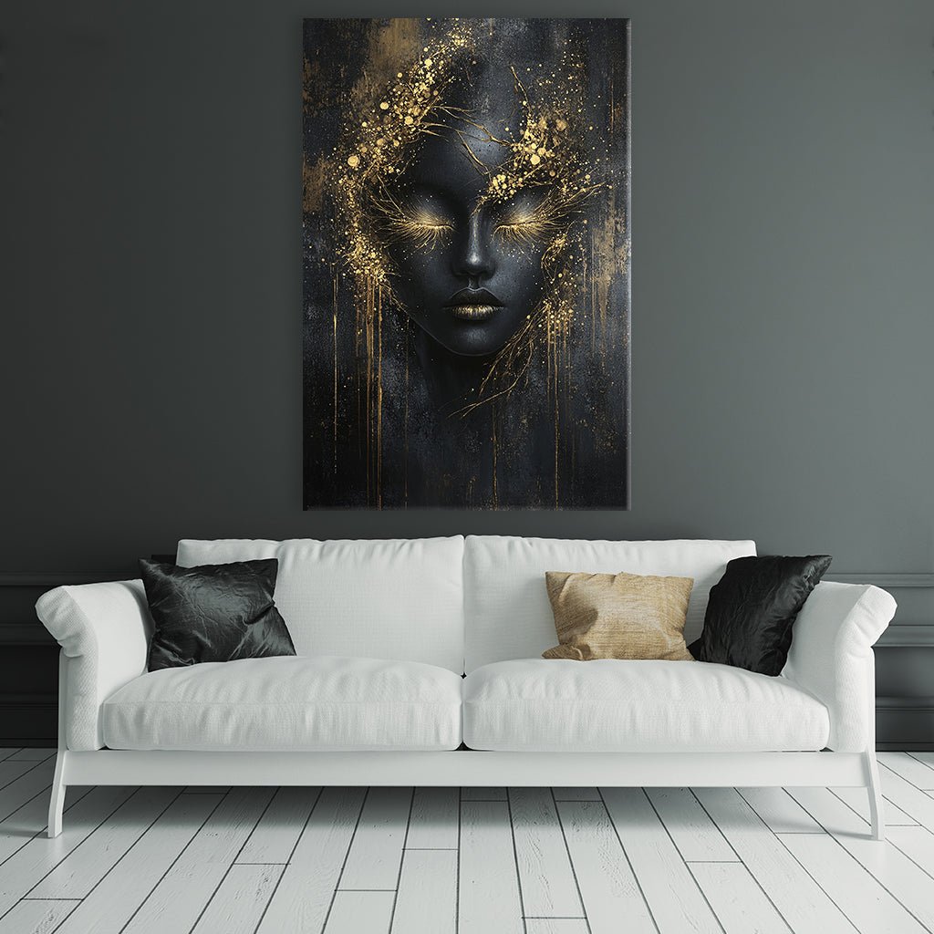 This captivating image features a mysterious, dark woman whose face is adorned with gold accents. Her gaze is downcast, her eyes closed, evoking a sense of peace and calm. The color palette is dark and moody, with black and gold dominating. The gold accents add a touch of opulence and drama to the image.