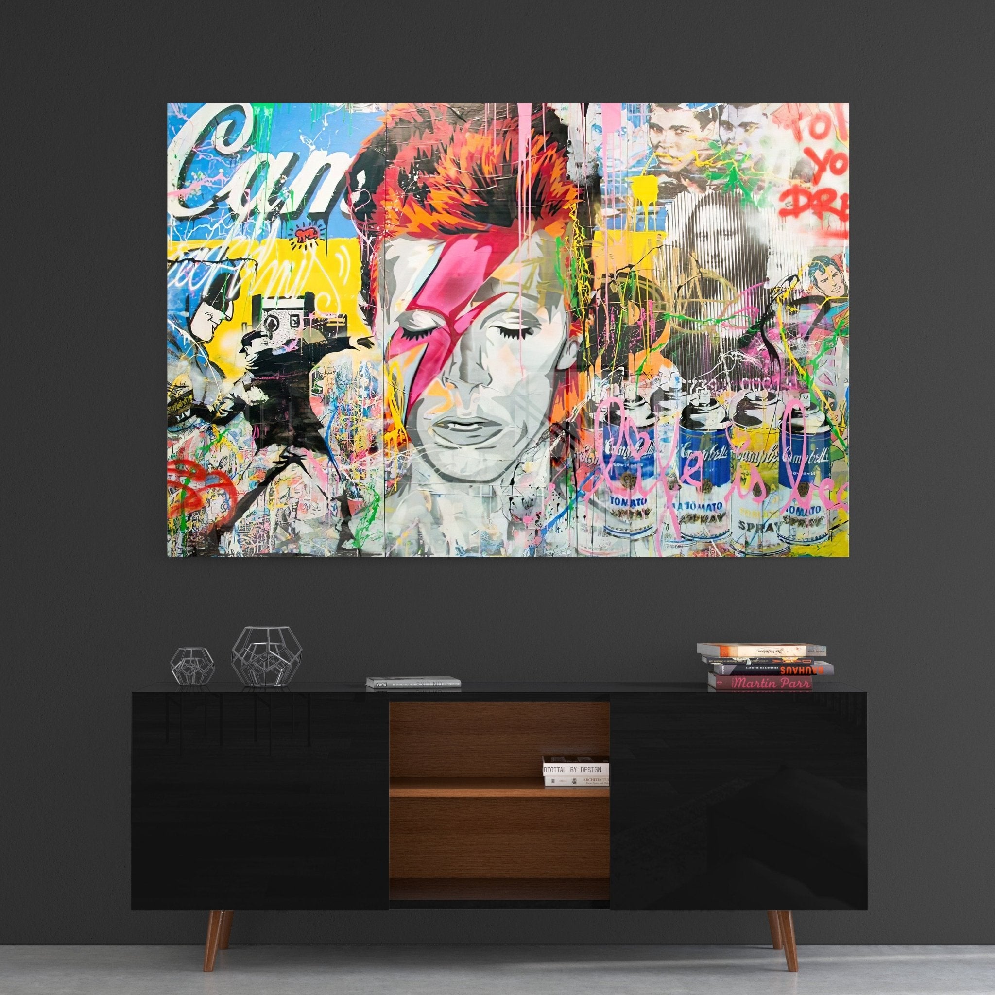 An unusual motif with parts of Banksy Follow your Dreams and the flower thrower, Batman, Mona Lisa, Muhammad Ali and David Bowie was depicted in graffiti on a wall.