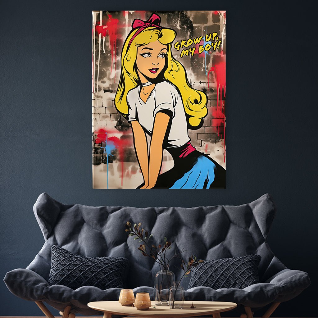 A cartoon princess-style figure reminiscent of Cinderella, with long blonde hair and a red bow, wearing a white T-shirt and a blue skirt. She's looking sideways and smiling. In the background, a brick wall is decorated with red and blue paint splatters and graffiti. The phrase "GROW UP, MY BOY!" is written in yellow in the upper right corner.