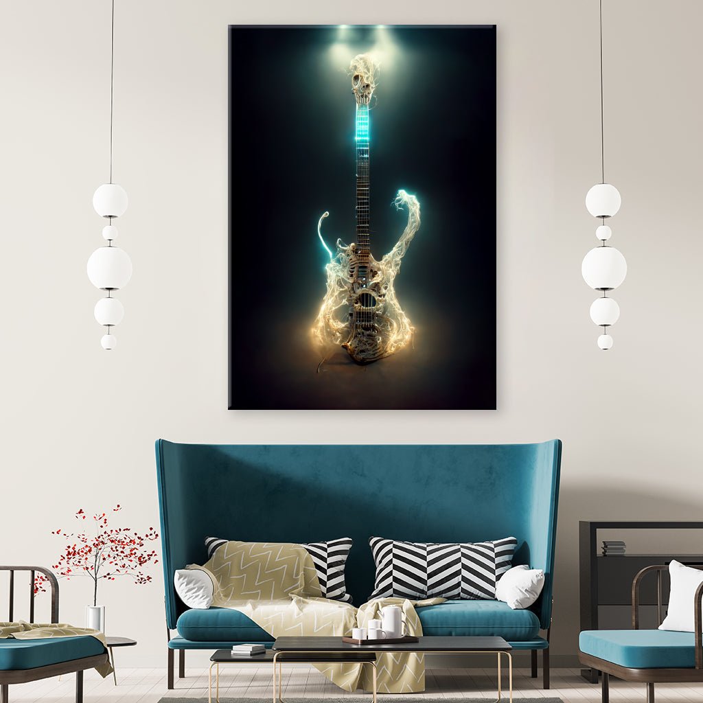 The image shows a guitar placed on a dark background. The body of the guitar consists of smoke and electric effects in different shades of blue and yellow that merge together. The motif creates an atmosphere of energy and passion.