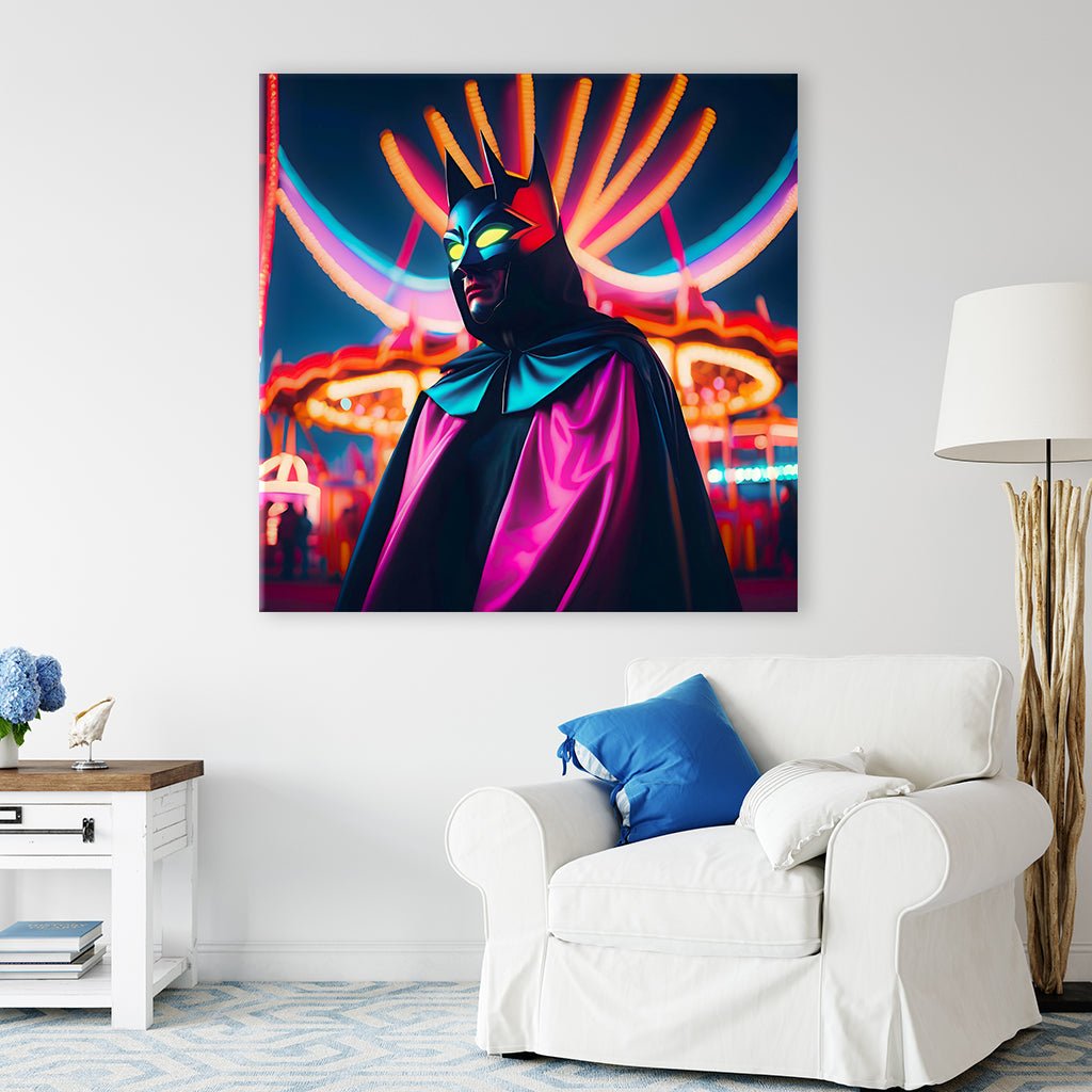 At a lively fair at night, the focus of the picture is a person who is reminiscent of the superhero Batman. Behind her is a brightly lit carousel that bathes the background in a fascinating play of lights. The person stands there with a gloomy expression and a purple cape, while the colorful lights of the carousel frame her silhouette and create a mysterious atmosphere.