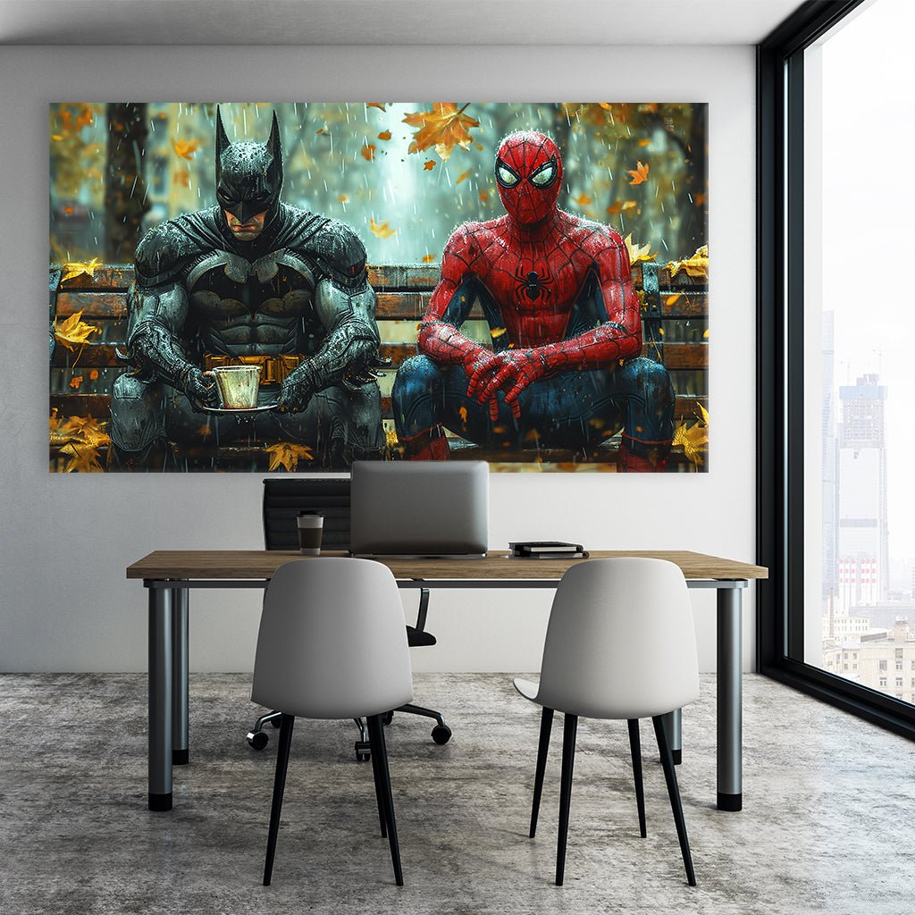 The scene shows Batman and Spiderman sitting on a park bench in autumn. Gentle raindrops fall around them while Batman holds a cup of coffee in his hands. Batman is depicted in his dark suit and cape while Spiderman wears his vibrant red and blue costume. The scene is painted in a painterly manner, with a focus on the romantic atmosphere of autumn and the calm serenity of the two superheroes in a rare moment of relaxation.