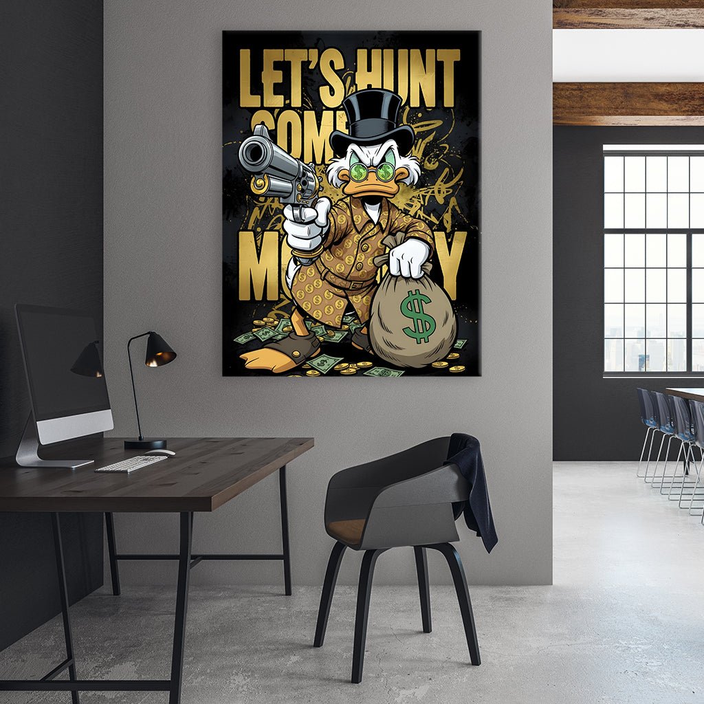 Scrooge McDuck poses grimly with a revolver, top hat, and a bulging moneybag. His dollar-patterned coat and the gold lettering emphasize the theme of wealth. The depiction reinterprets the classic comic book character in a provocative, modern street art style.