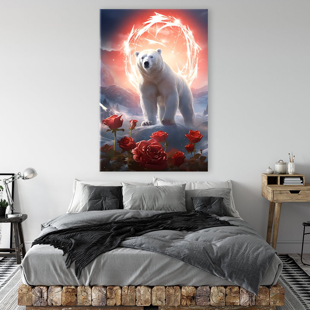 A majestic polar bear wanders through the icy Arctic while red roses in the foreground add an unexpected touch of tenderness. Behind the polar bear there is a mysterious ring of light that looks like a portal that leads to another world. This fascinating image fuses the harsh beauty of the Arctic with the elegance of roses and the magic of a possible transition into a hidden sphere.