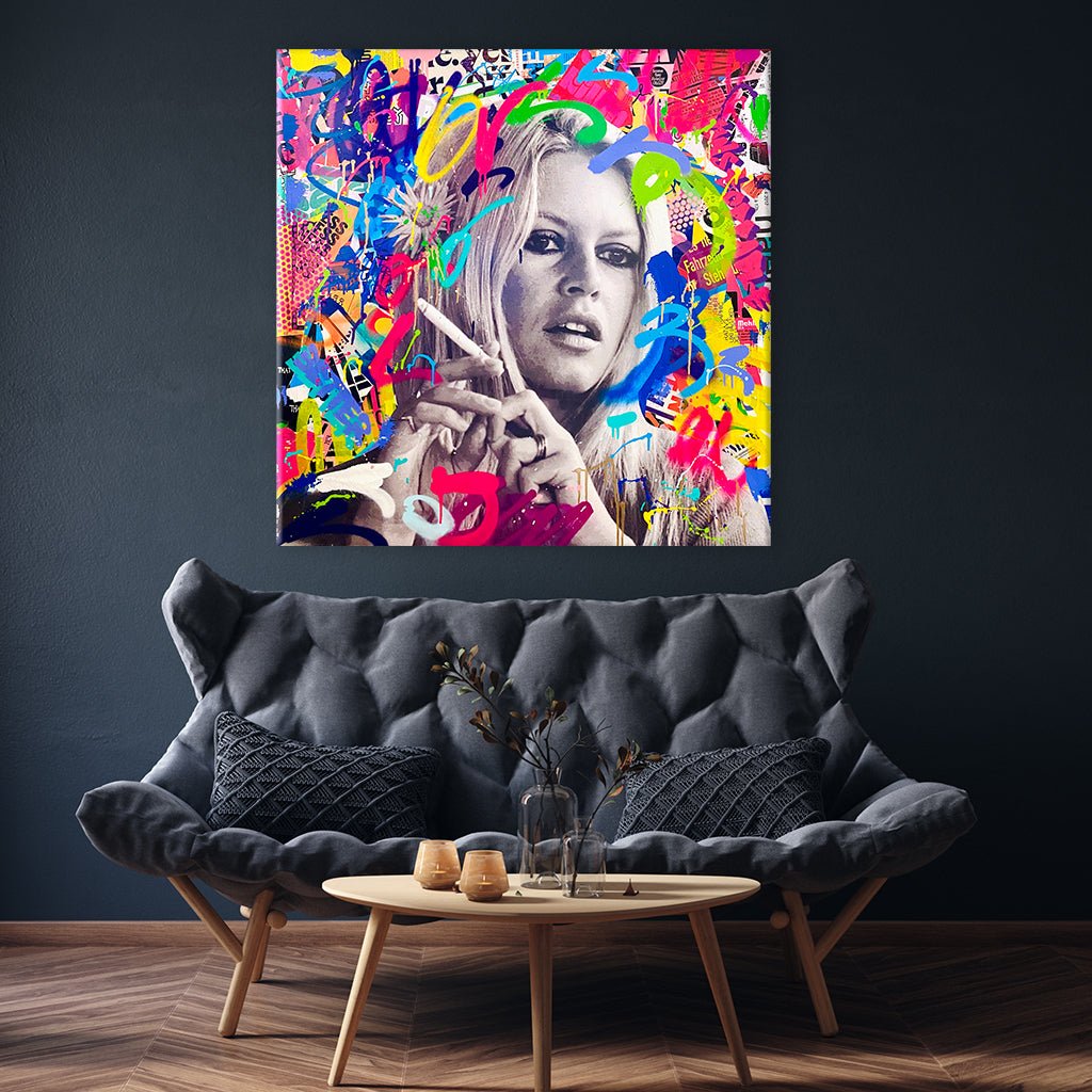 The "Iconic BB" motif shows a young icon in black and white surrounded by a bright and colorful background. The young woman's gaze captivates and makes it an eye-catcher on your picture wall in the living room, bedroom or hallway.