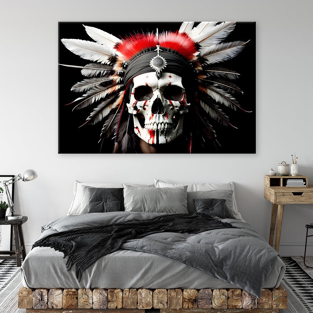 A skull in a pirate look meets the splendor of an Indian chief, decorated with large feathers. This captivating motif merges two fascinating worlds into one work of art. The pirate skull presents itself with the typical headscarf look, while it is framed by the magnificent feathers of an Indian chief. This unique work of art is an eye-catcher full of contrasts and stories.