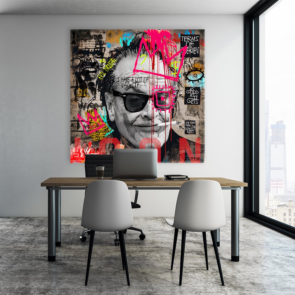 A black-and-white portrait of Jack Nicholson wearing sunglasses and a cigarette, overlaid with bright pink, yellow, and turquoise graffiti elements, including two crowns and a quote: "I HAVE A LOT OF VANITY." The background consists of collage elements and other lettering, creating a raw, urban aesthetic and alluding to his film roles.