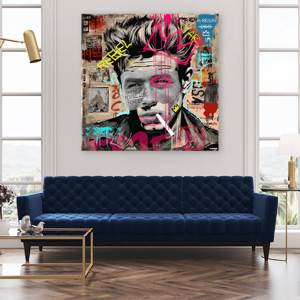 A striking black-and-white portrait of James Dean with his signature hairstyle and a cigarette in his mouth. His face is overlaid with vibrant pink and turquoise graffiti elements, including a jagged crown and a quote: "DREAM AS IF YOU'LL LIVE FOREVER." The background is a collage of newspaper fragments and other graffiti lettering, such as "REBEL," underscoring his iconic role.