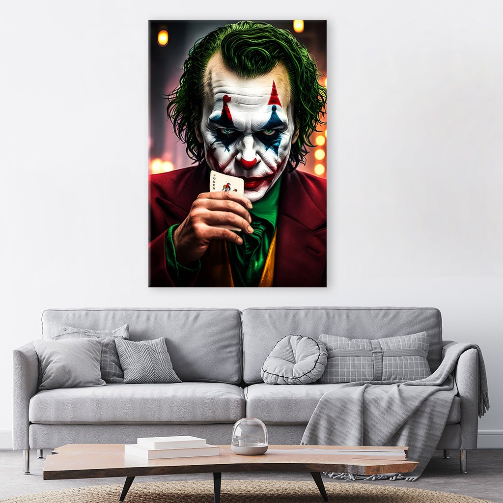 A sinister gaze, green hair, and the iconic red jacket—this portrait of the Joker captures the eerie allure of this legendary character. The detailed facial paint lends the image its terrifying charm. This artwork is perfect for fans of the Joker and lovers of the dark side of comics.