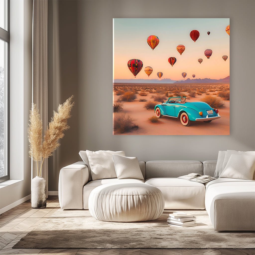 A light blue vintage car stands alone in the vastness of the desert. Surrounded by dry bushes, the classic car radiates a charming contrast to the barren surroundings. In the background, majestic mountain landscapes rise up, giving the scene depth and perspective. Several hot air balloons float gently in the sky, which add a colorful and dreamy element. The whole scenery combines vintage charm with a wide open desert landscape and a touch of adventure.
