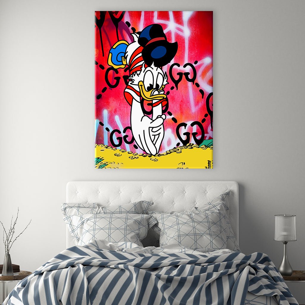 The scene shows Scrooge McDuck making an acrobatic leap into his gigantic sea of golden coins and banknotes. The background is red with the initials of Gucci to emphasize the magnitude of his wealth.