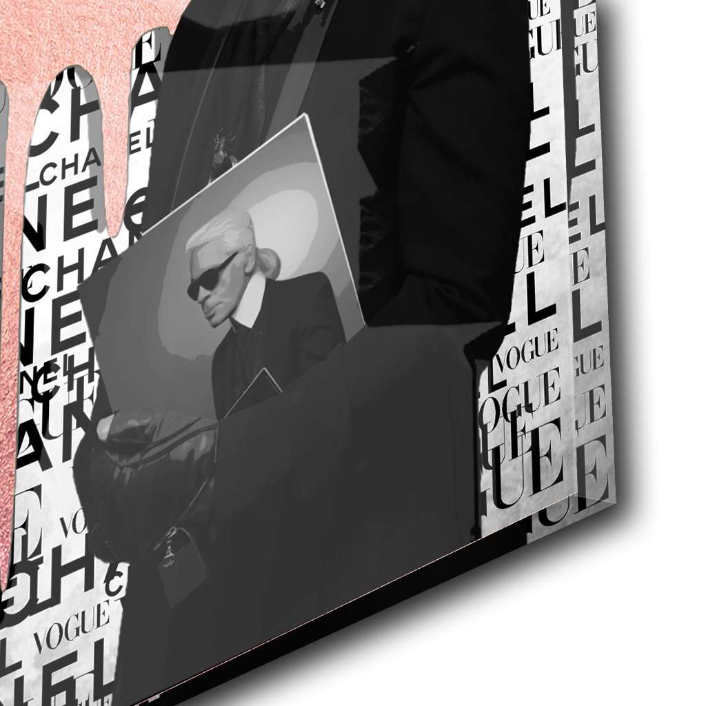 The painting "KARL BRAND by RS Artist Rosé on Acrylic" is a tribute to the famous fashion designer Karl Lagerfeld. In the foreground is a black and white portrait of Karl Lagerfeld, while in the background the Chanel logo is emblazoned in silver leaf. The Chanel logo has a drip effect and the words Chanel and Vogue are repeated over and over in black text. The gray background of the painting provides the perfect stage for the Chanel logo and the portrait of Karl Lagerfeld.