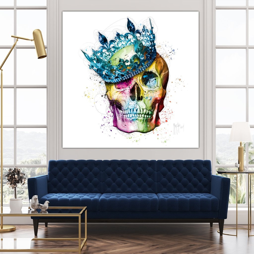 This image depicts a skull with a crown on its head. Exceptionally staged with soft, bright colors, it reminds us of many a king who has passed away.