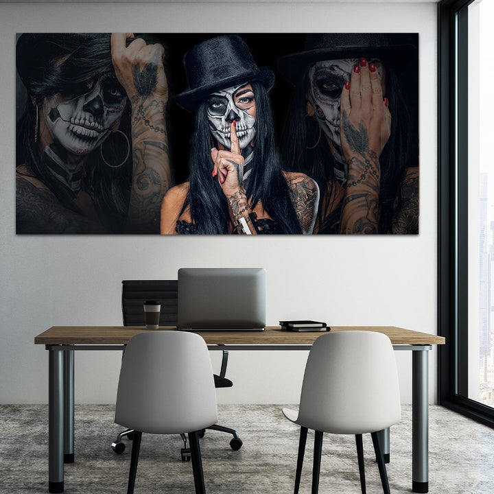 The tattooed woman, who can be seen in three poses in this motif, appears somewhat mystical due to the strong black and white accents and the transparency of the two poses in the background. In two of her poses she gives the impression of “see nothing and see nothing.” This is a meaning originally from Japan that means "overlooking bad things." In combination with the body painting of the bone areas on the face and the black hat, this motif stimulates thought and allows the viewer to linger in thought.