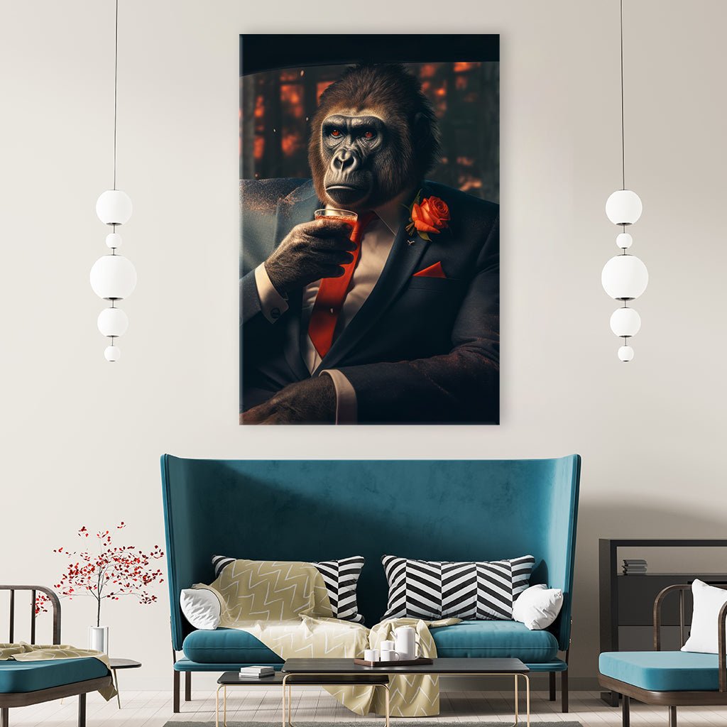Our gorilla is the leader of his metropolis and appears in his portrait in a human pose, in a noble black suit with a red tie and a red boutonniere. With a drink in hand, our gorilla drives purposefully through the night. The picture radiates a mixture of elegance and humor that fascinates every viewer.