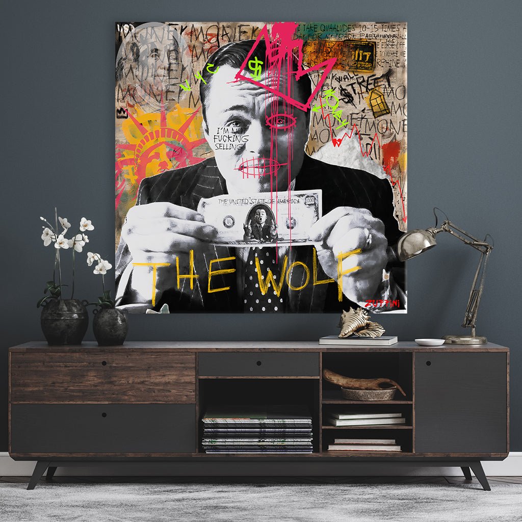 A black-and-white portrait of Leonardo DiCaprio as Jordan Belfort, holding a dollar bill, overlaid with bright pink and yellow graffiti elements, including a crown and a quote: "I'M NOT FUCKING SELLING." The background is a chaotic jumble of lettering like "MONEY MONEY" and financial symbols, echoing the film "The Wolf of Wall Street."