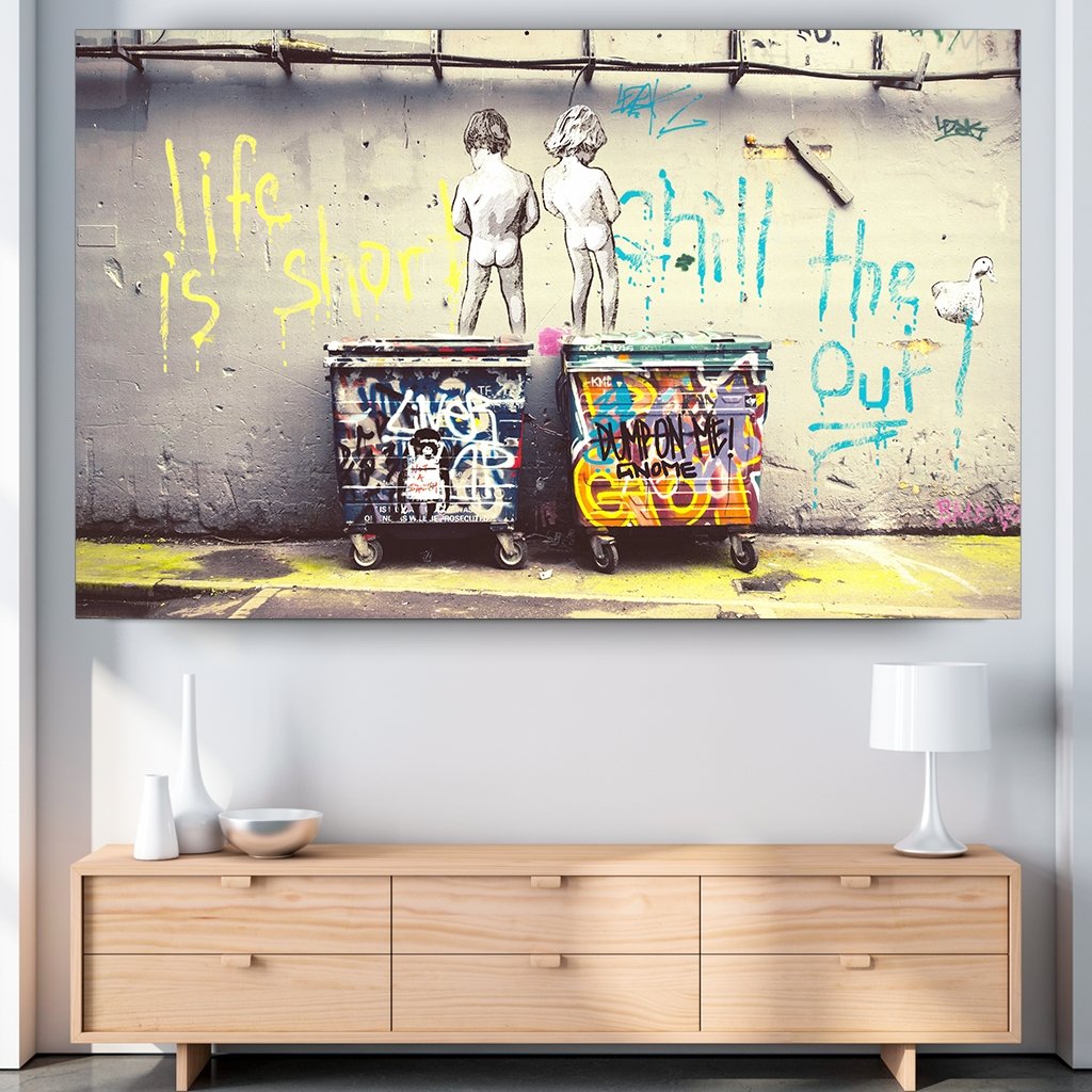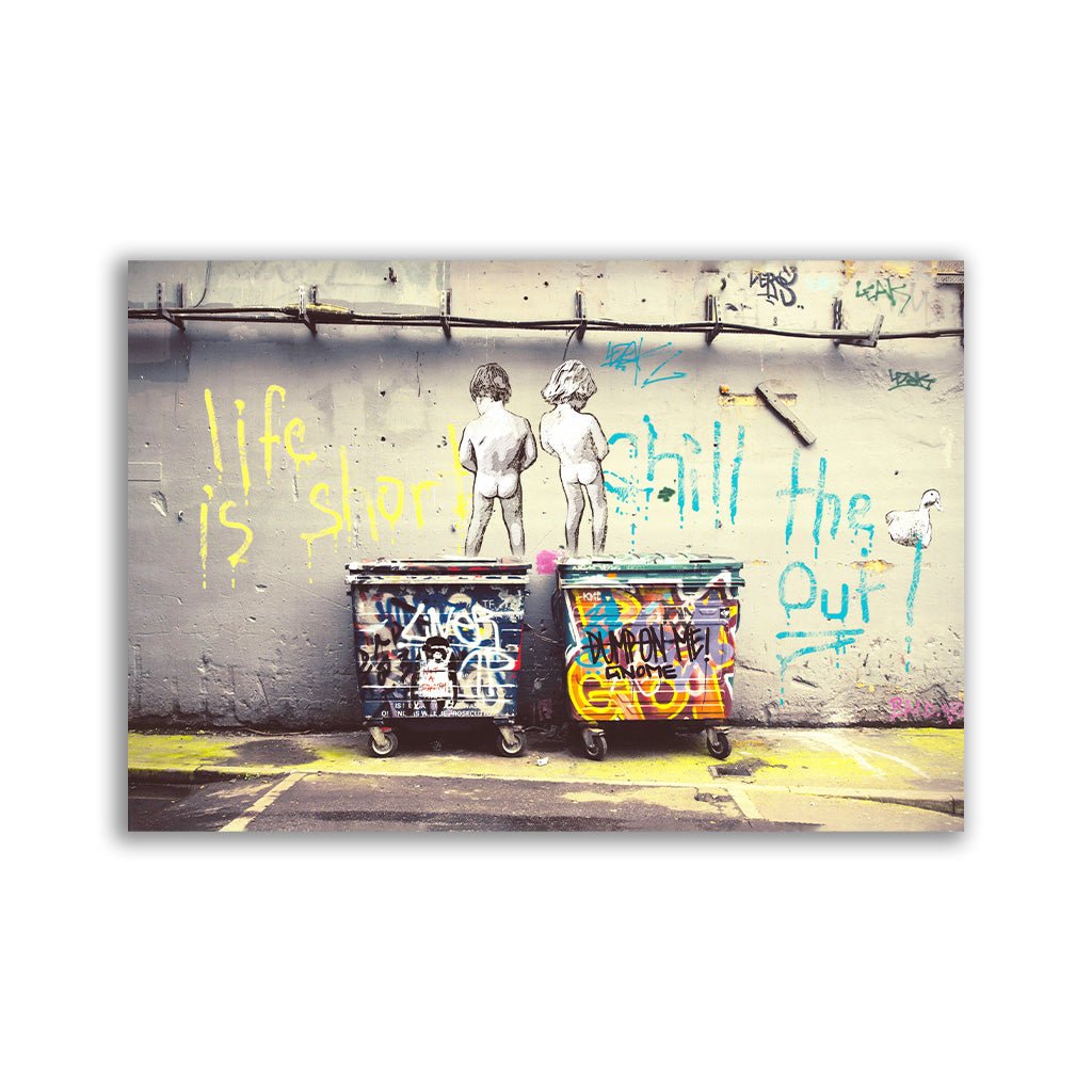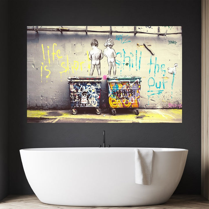 The street art motif with the saying "Life is short, chill the duck out" by Banksy is intended to remind us that life is too short to let it pass us by. The slogan has been sprayed with graffiti on the wall in the background.