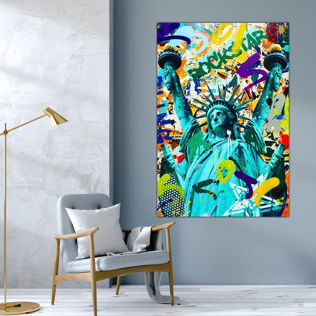 The Statue of Liberty rocks modern on an abstract and colorful background in street art style. An extraordinary eye-catcher on your picture wall in the living room, bedroom, kitchen or office.