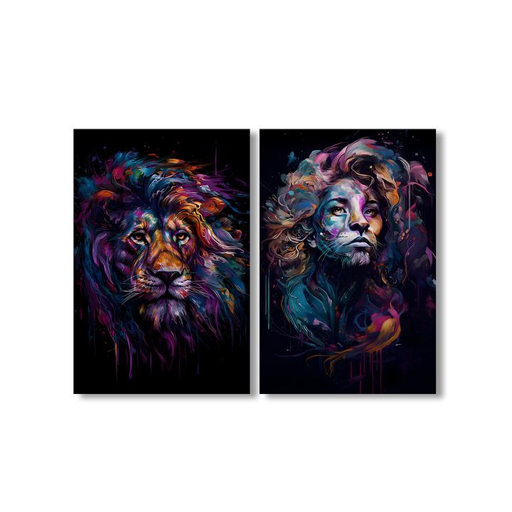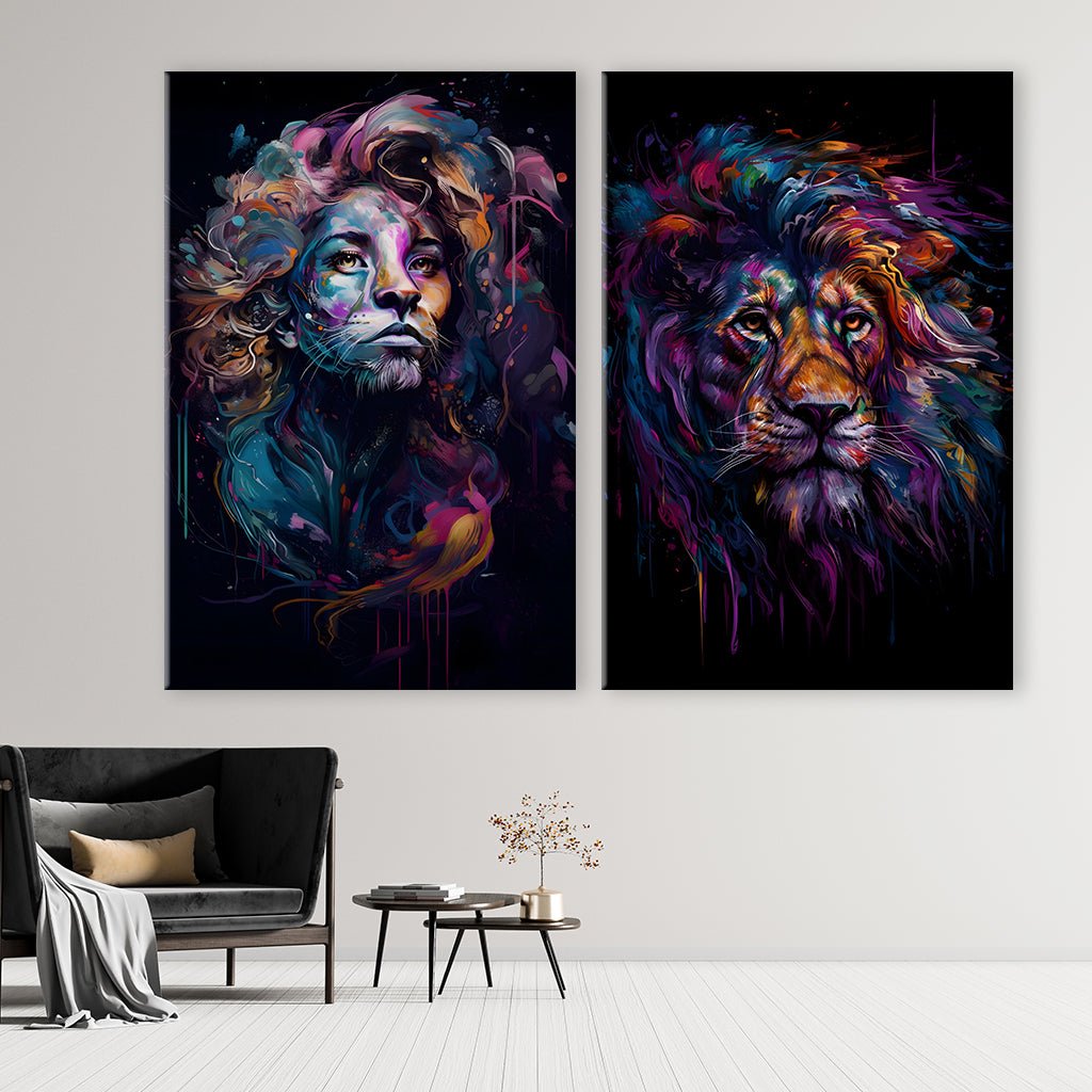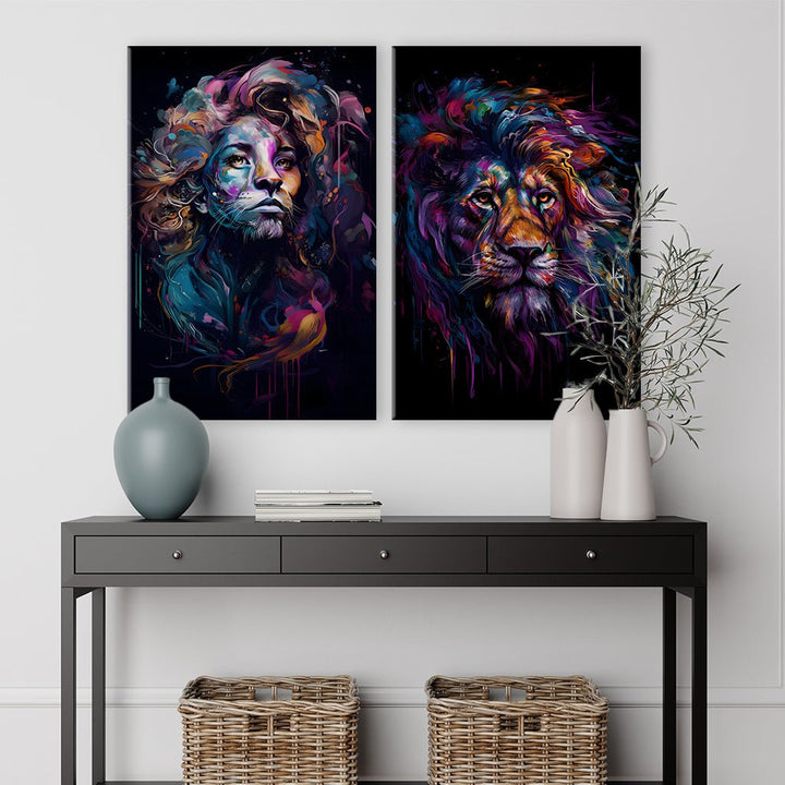 Many small, colorful blobs of color and lines create these fascinating two motifs, which can be seen on a black background. The many small blobs of color create a unique work of art that wonderfully combines the beauty of the lion and its transformation and the creativity of the artist.