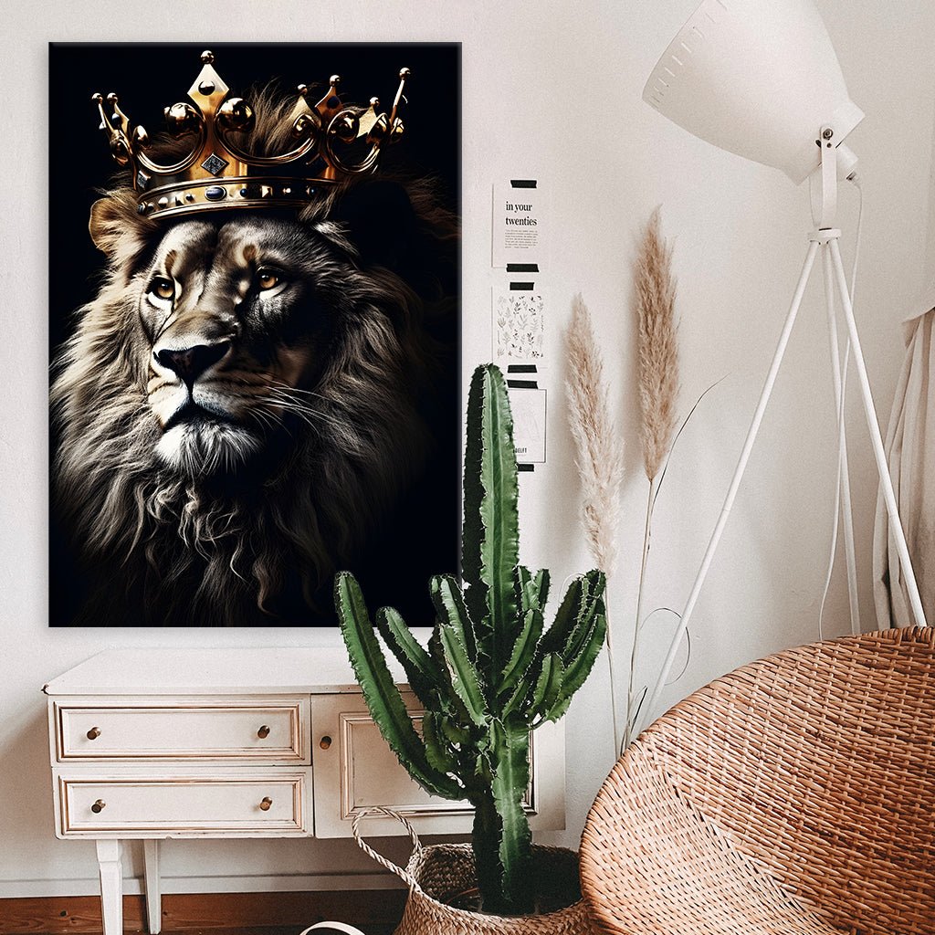 A majestic lion is depicted in stunning close-up, with an imposing crown perched atop its head. The fascinating lighting design emphasizes the royal aura of the subject. This stunning work of art will be an eye-catcher in any living room, bedroom or hallway. Let yourself be enchanted by this captivating work and bring the grace and elegance of the Lion King into your home.