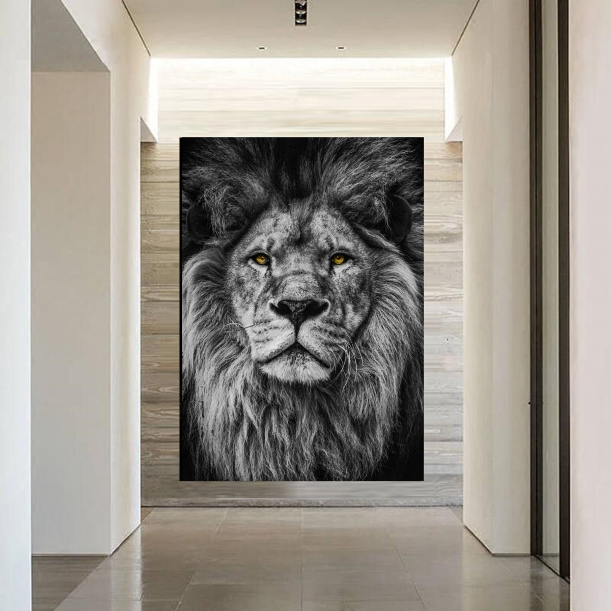 The lion is, along with the tiger, one of the two largest species in the cat family. Lions are the most social of cats and are the only ones to live in groups. The lion in our picture has a magnificent mane and his orange eyes, which look down on you through the black and white design, are a great eye-catcher.
