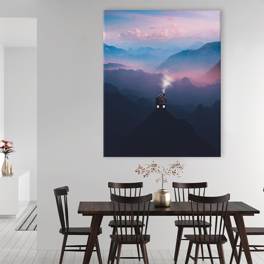 This surrealistic motif shows a lonely house on the top of a mountain. Smoke rises from the chimney and there are lights on in the windows. Deserted and in complete silence surrounded by mountains at the highest point.