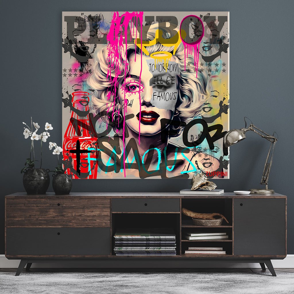 The image features an iconic portrait of Marilyn Monroe overlaid with vibrant pink and yellow graffiti elements, including a crown and the quote "TOMORROW I'LL BE FAMOUS." A red Coca-Cola bottle is visible in the foreground, and the background is decorated with logos such as "PLAYBOY" and other lettering, blending a pop art and street art aesthetic.