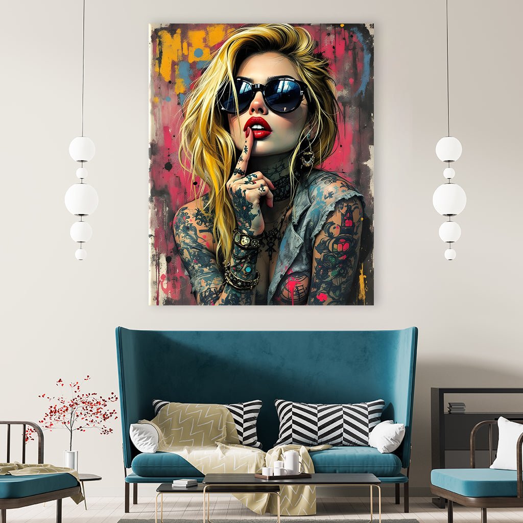 A tattooed woman with sunglasses and red lips poses mysteriously against a colorful street art background. Her striking look and provocative gesture convey a rebellious, modern aura. The illustration cleverly combines urban art with an expressive portrait.