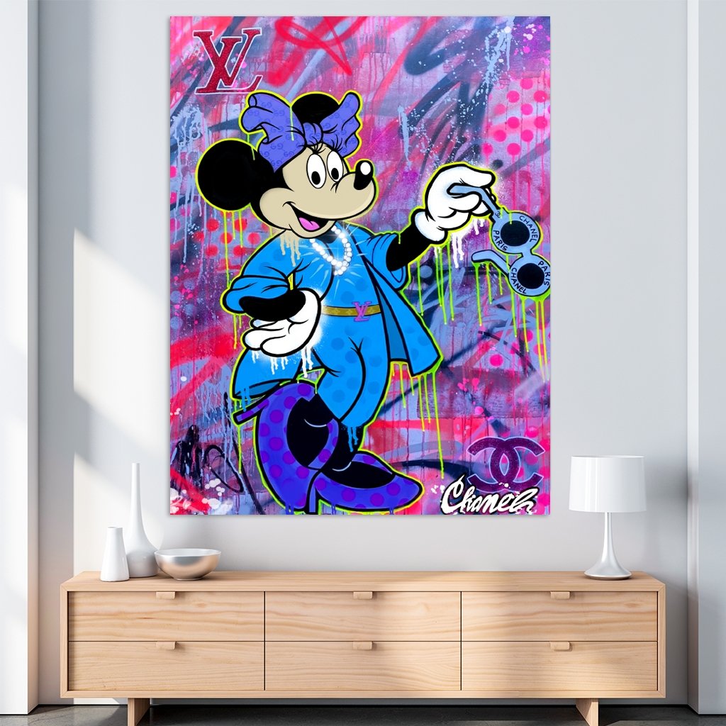 Dear Minnie Mouse as you don't know her otherwise. Fashionably dressed with exclusive accessories from Louis Vuitton and Chanel. Our Minnie is perfectly in the abstract and the shades of purple, pink and blue are a real eye-catcher.