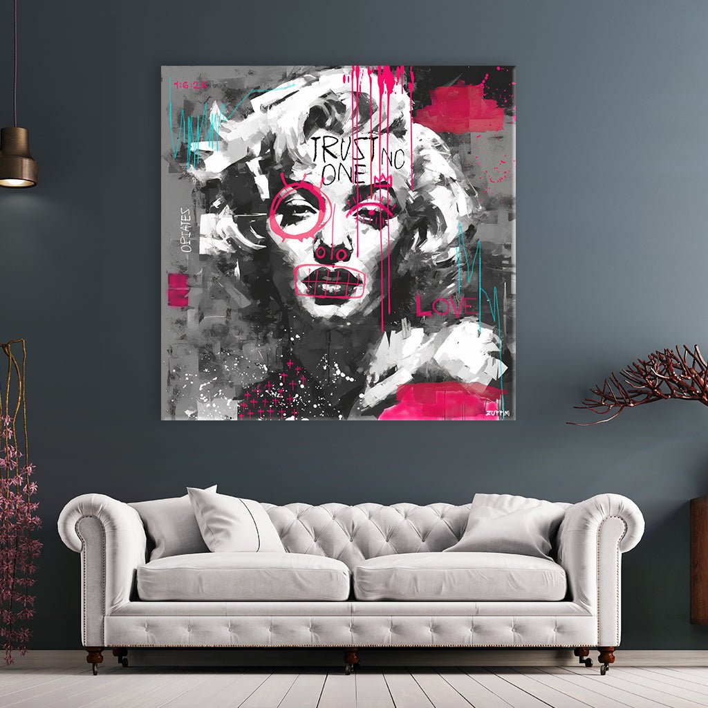 The image is a black-and-white, crudely painted portrait of Marilyn Monroe, overlaid with striking pink and turquoise graffiti elements. Particularly striking are the pink paint splashes dripping down her face and the words "TRUST NO ONE" directly on her forehead. The composition appears raw and expressive, with a melancholic undertone.
