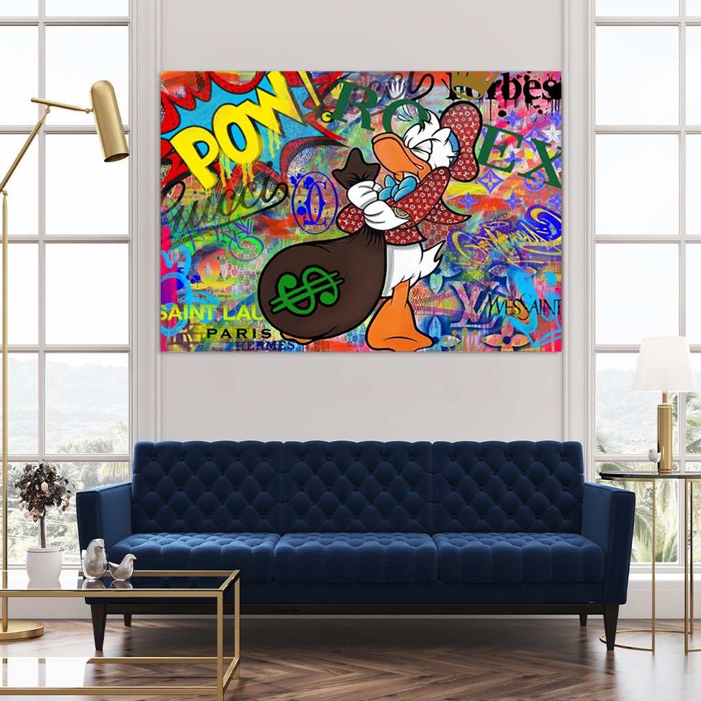 Donald Duck is pulling a large, heavy money bag, and you can tell it must be full of coins. Dressed in luxury Louis Vuitton textiles and sporting a luxury watch on his wrist, he's depicted in bright colors against a graffiti background.