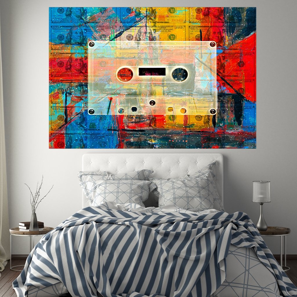 A transparent white cassette on an abstract colorful background with dollar bills lined up. A colorful eye-catcher for your wall in the living room, bedroom, hallway or office.